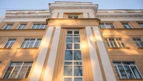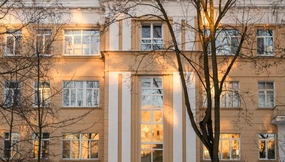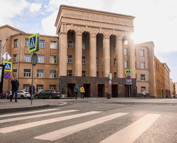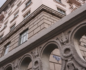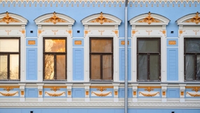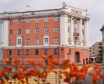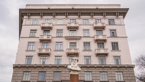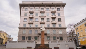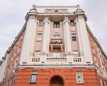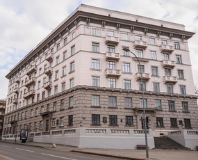 Монументальное сооружение, построенное в конце 30-х годов — это наш «Дом на Набережной» для высших чинов, здесь жили летчик Чкалов и актер Солоницын, а в стенах, возможно, была установлена прослушка. Здание выполнено в стиле постконструктивизма с элементами, унаследованными из эпохи Возрождения, потолки в квартирах выше трех метров, широкие коридоры, предусмотрены были даже комнаты для прислуги.